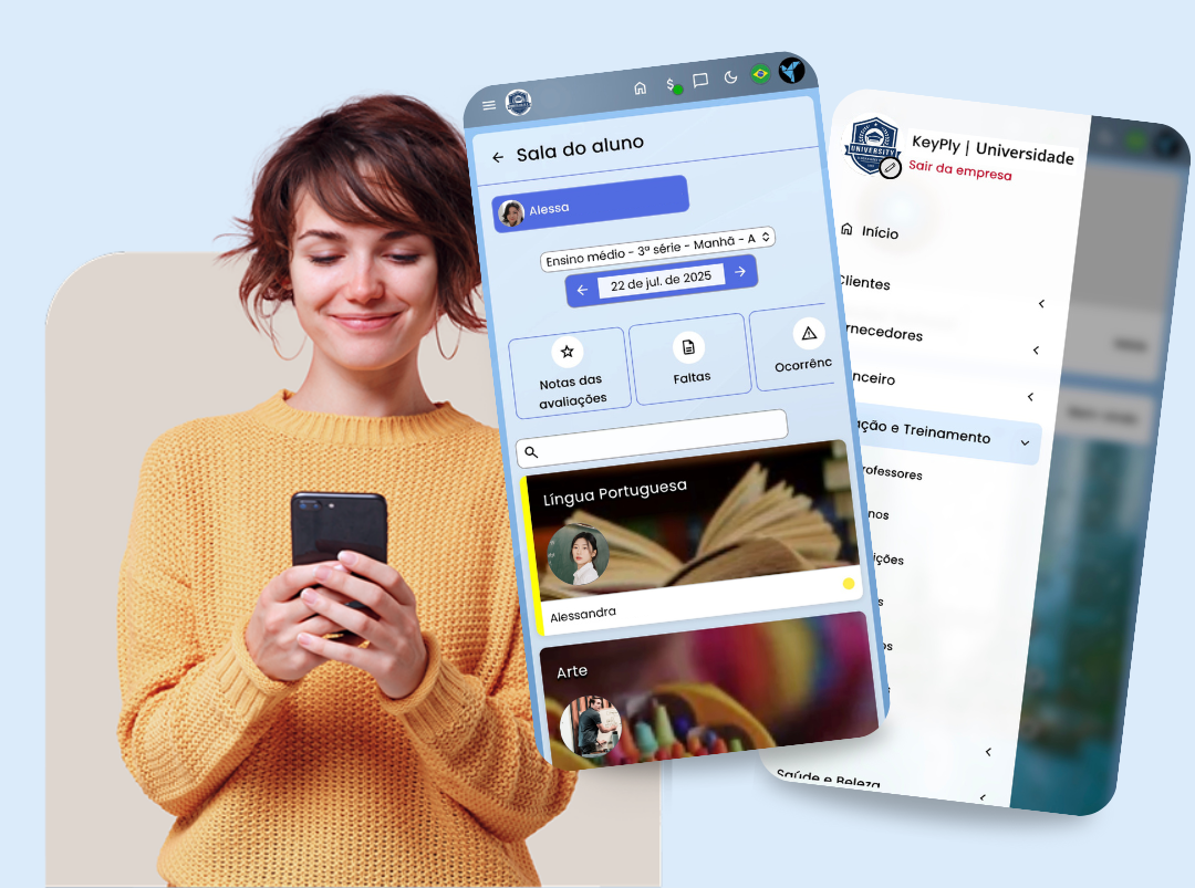 Painel financeiro, acompanhamento de notas, carteirinha digital, boletim online, questionários e muito mais!